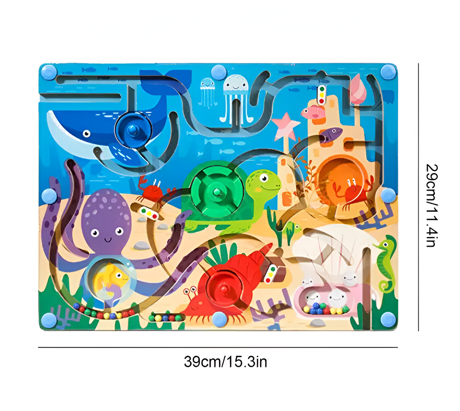 Joc de Sortare Culori din Lemn tip Montessori, Berbis, Model Animale Marine, Creion Magnetic, Tip Labirint Ilustrat, 39x29x1.5 cm