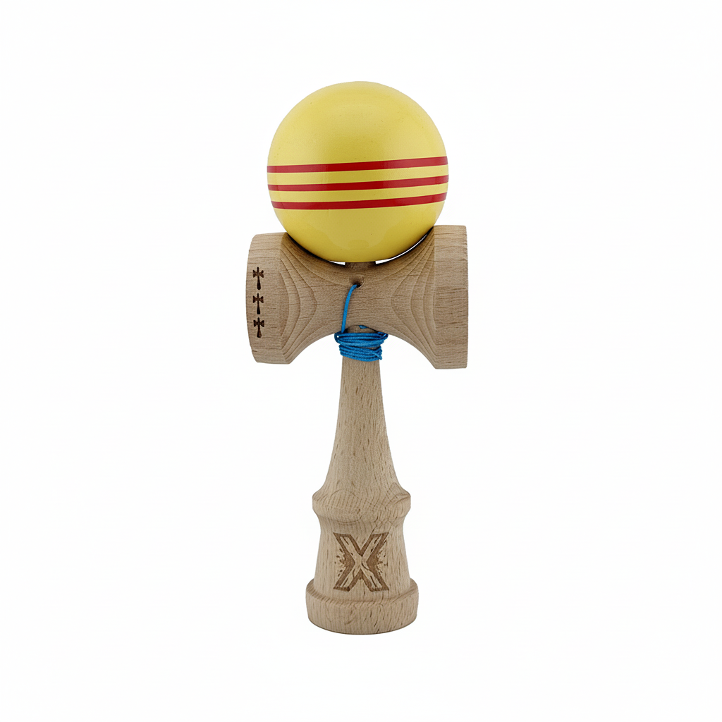 Kendama X Originala, Model Galben cu Linii Rosii, Profesionala, Legendary, Cupe Mari, Super Sticky, Rulment, Ata 55cm