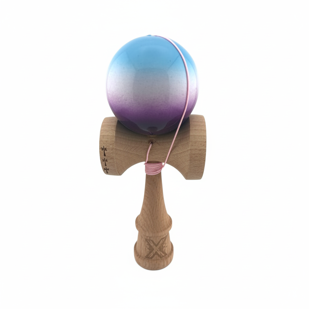 Kendama X Originala, Model Albastru / Alb / Mov in Degrade, Profesionala, Cupe Mari, Super Sticky, Rulment, Ata 55cm