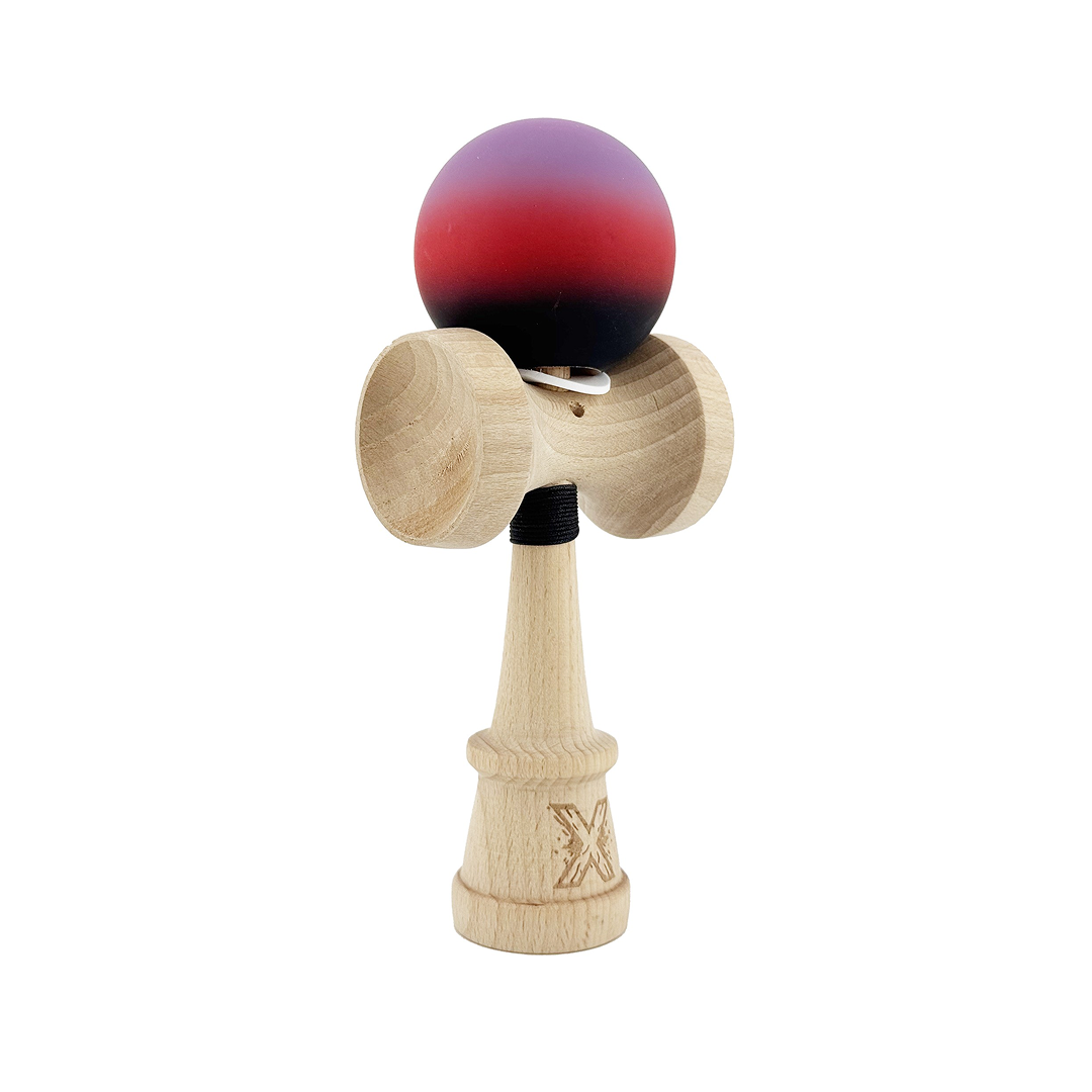 Kendama X Originala, Model V3 Mov / Rosu / Negru in Degrade, Profesionala, Cupe Mari King Size, Rubber Grip, Gaura in Baza, Rulment, Ata 55cm